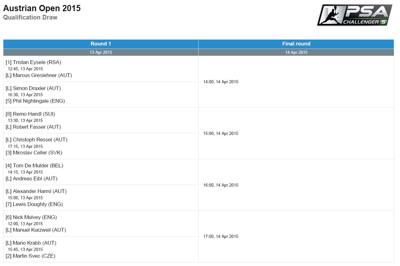 Etwas verspätet wurde soeben die Auslosung zum Qualifikation der Austrian Open im EUROPARK Salzburg bekanntgegeben.