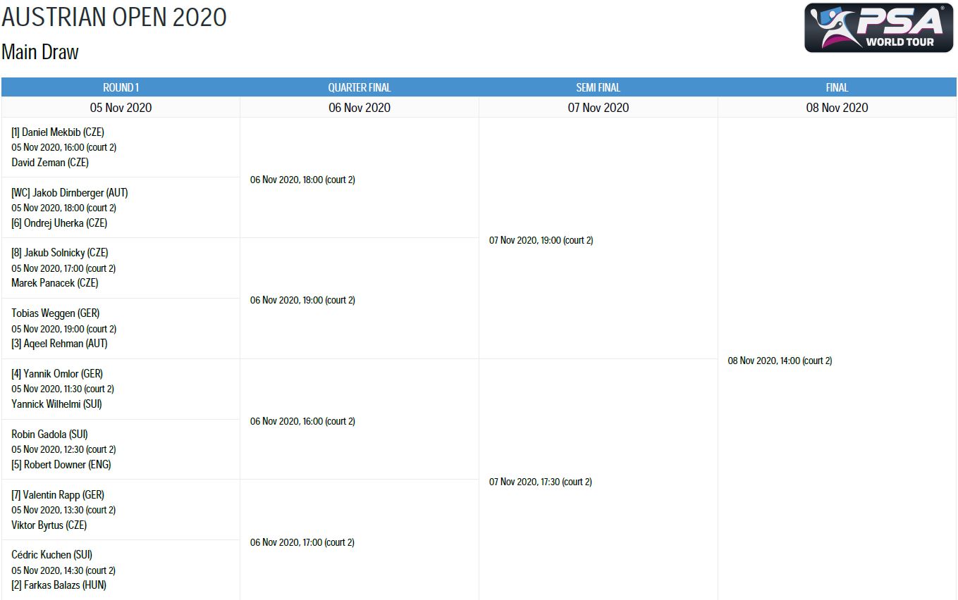 Zusätzliche Livescores und Berichterstattung erfolgt auch auf der Homepage der PSA und der Squashsite.